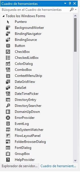 Cuadro de Herramientas: es el Diseñador de los formularios, para desarrollar rápidamente interfaces de usuario con el mouse, Muestra componentes que puede agregar a los forms.